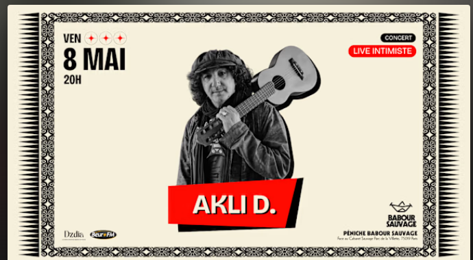 Akli D. propose un live intimiste au Babour Sauvage à Paris le vendredi 8 mai 2026. Ouverture des portes à 19h et concert à 20h.
