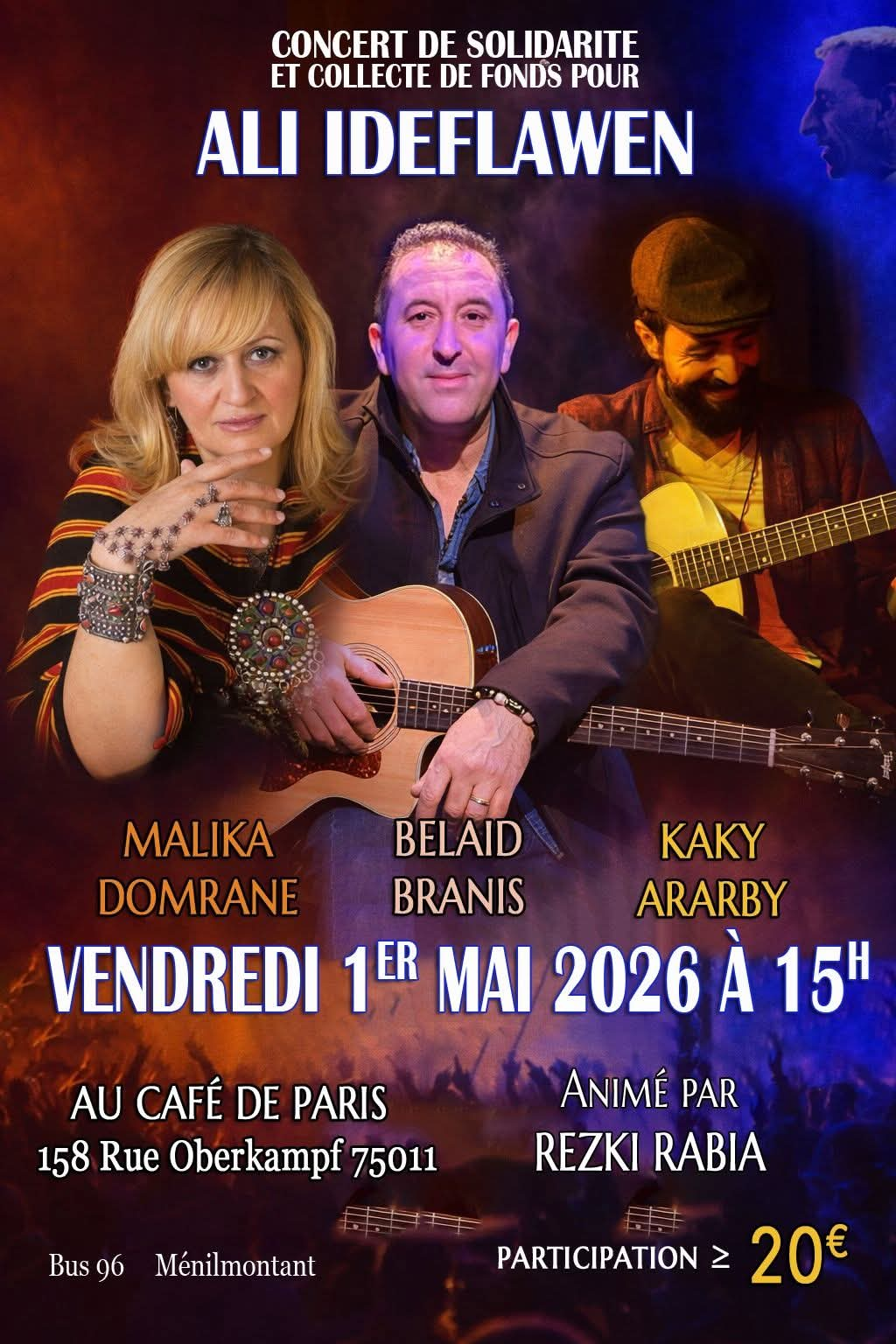 Concert de solidarité et collecte de fonds pour Ali Ideflawen au Café de Paris, 158 rue Oberkampf à Paris, le vendredi 1er mai 2026 à 15h. Avec Malika Domrane, Belaid Branis et Kaky Ararby, animé par Rezki Rabia. Participation annoncée à 20 €.
