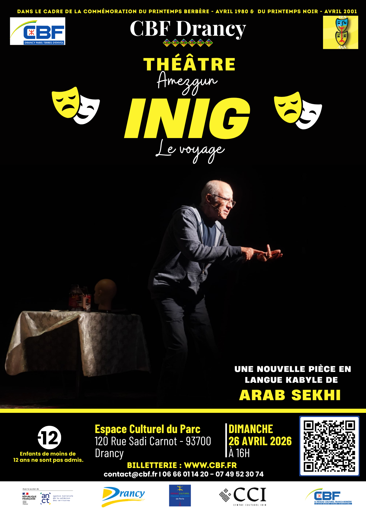 CBF Drancy présente Inig (Le voyage), une nouvelle pièce en langue kabyle d'Arab Sekhi à l'Espace Culturel du Parc à Drancy le dimanche 26 avril 2026 à 16h. Enfants de moins de 12 ans non admis.