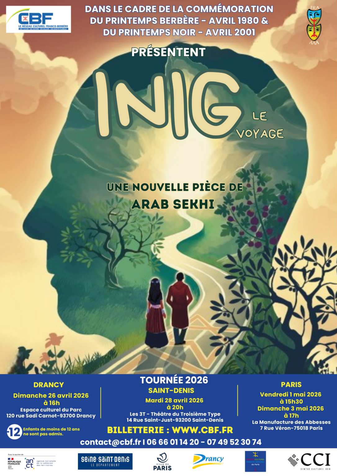 INIG – Le Voyage, une création théâtrale en langue kabyle d'Arab Sekhi, est présentée à La Manufacture des Abbesses à Paris le vendredi 1er mai 2026 à 15h30.