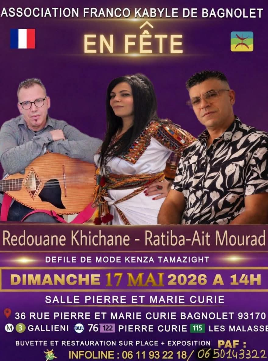 L'Association Franco Kabyle de Bagnolet organise une journée en fête à la Salle Pierre et Marie Curie à Bagnolet le dimanche 17 mai 2026 à 14h. Avec Redouane Khichane, Ratiba-Ait Mourad et un défilé de mode Kenza Tamazight, buvette et restauration sur place.