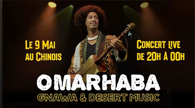 Gnawa & Desert Music Avec Omarhaba Au ChinoisMusique gnawaOmarhaba joue au Chinois à Montreuil le samedi 9 mai 2026 à 21h. Billets à partir de 10,59 €.ArtistesOmarhabaDatesamedi 9 mai 2026 à 21:00 - 23:59Ajouter à mon agendaLieuLe Chinois6 Place du Marché, 93100Montreuil, FranceOuvrir l'itinéraireRéserverPartager