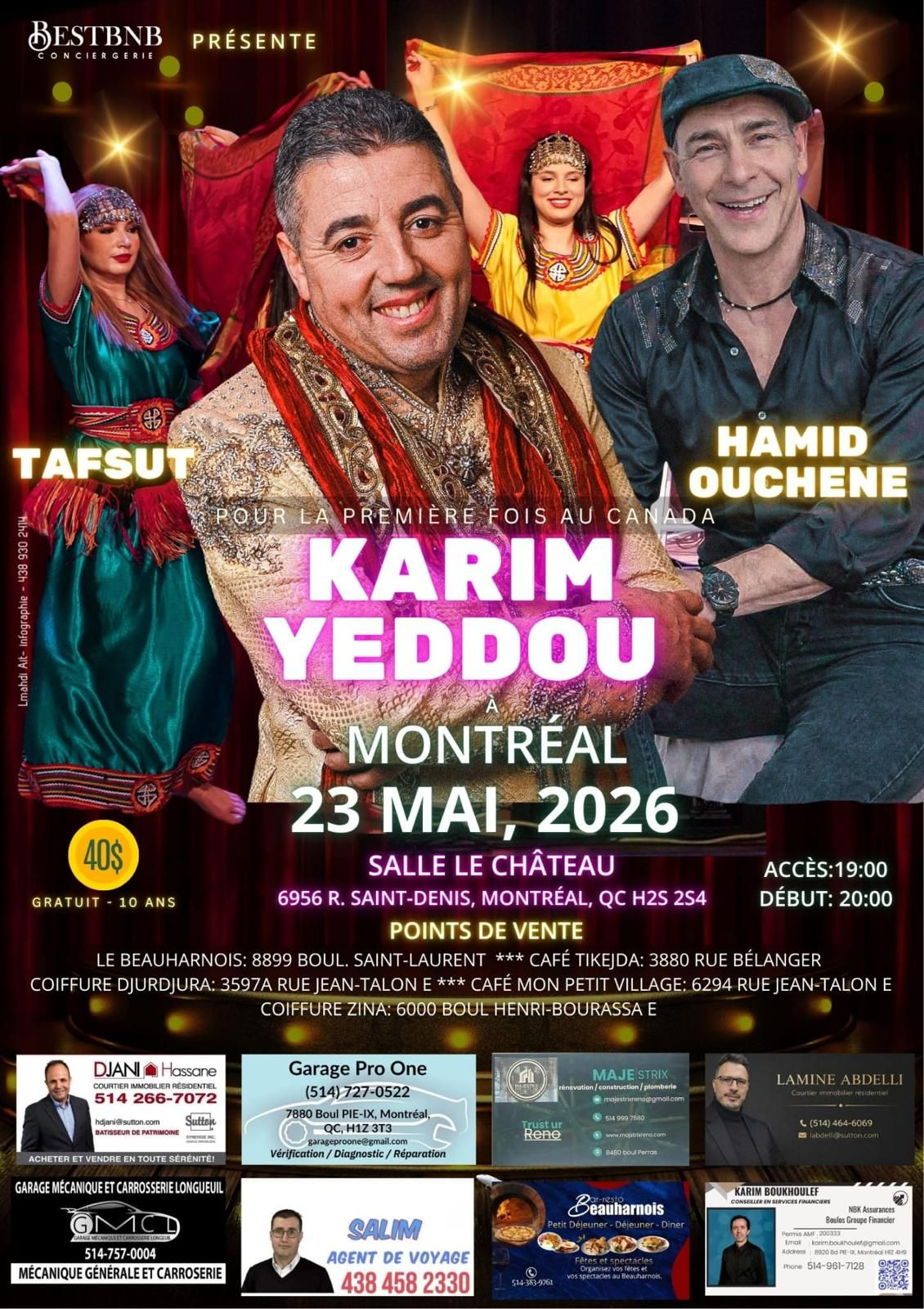 Tafsut présente Karim Yeddou à Montréal au Théâtre Le Château le samedi 23 mai 2026 à partir de 19h, avec un début de spectacle annoncé à 20h. Hamid Ouchene apparaît également sur l'affiche.